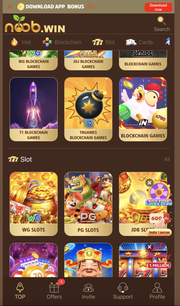 PG Slots The PG Slots section includes multiple themed slot titles from the PG software catalogue, with confirmed games including Fortune Tiger, Fortune Rabbit, and Fortune Gems. Each slot has its own payline structure, in-game bonus mechanics, and minimum spin cost starting at approximately 10 PKR. The PG Slots section offers the most visually varied game experience within the Noob Win Game lobby.